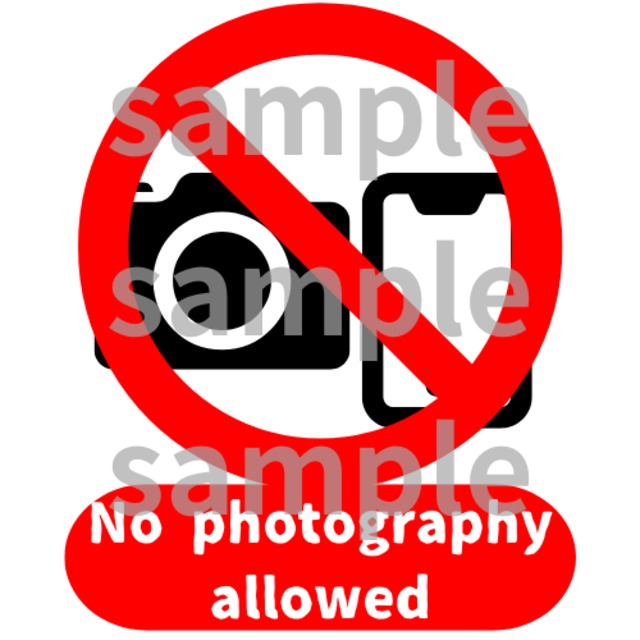 施設や店舗での撮影を制限したい場合に使える「撮影禁止」ステッカーです。 カメラとスマートフォンのイラストに赤い禁止マークを重ねた、 誰にでも分かりやすいシンプルなデザインになっています。 英語で「No photography allowed」と表記されており、 外国人観光客にもルールが伝わりやすい仕様です。 美術館・飲食店・宿泊施設・工場・展示会・イベント会場など、 撮影制限のある場所での掲示に最適です。 サイズ:S(10cm角)/M(15cm角)/L(20cm角)