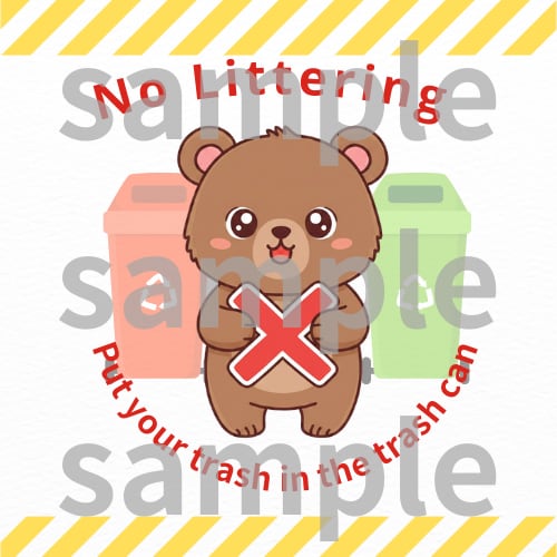 くまのキャラクターが「Put your trash in the trash can」と
